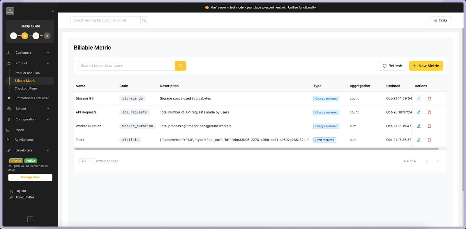 Access this module from the sidebar:Product β Billable MetricThe main list view displays all existing metrics, including: