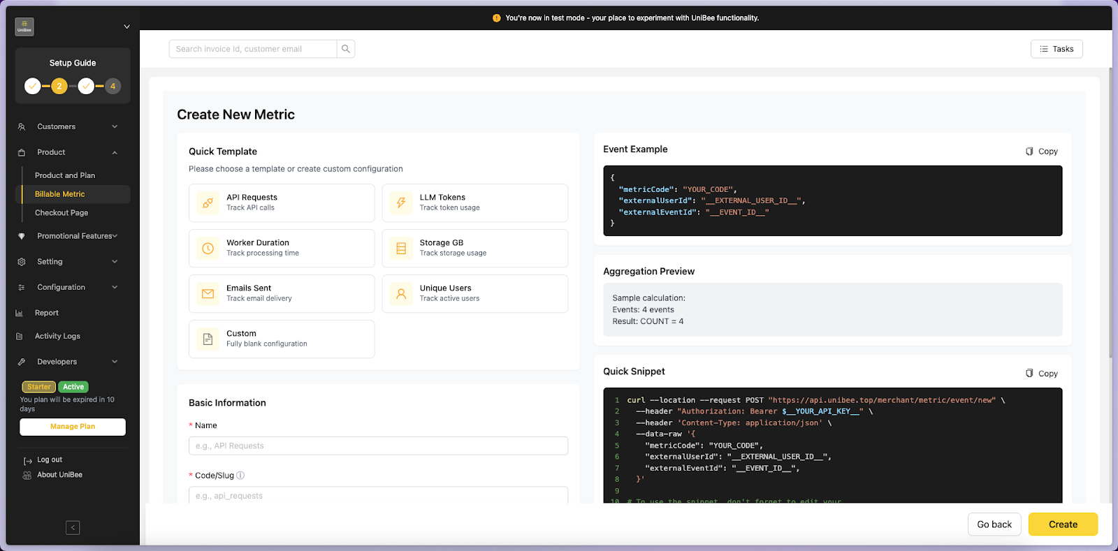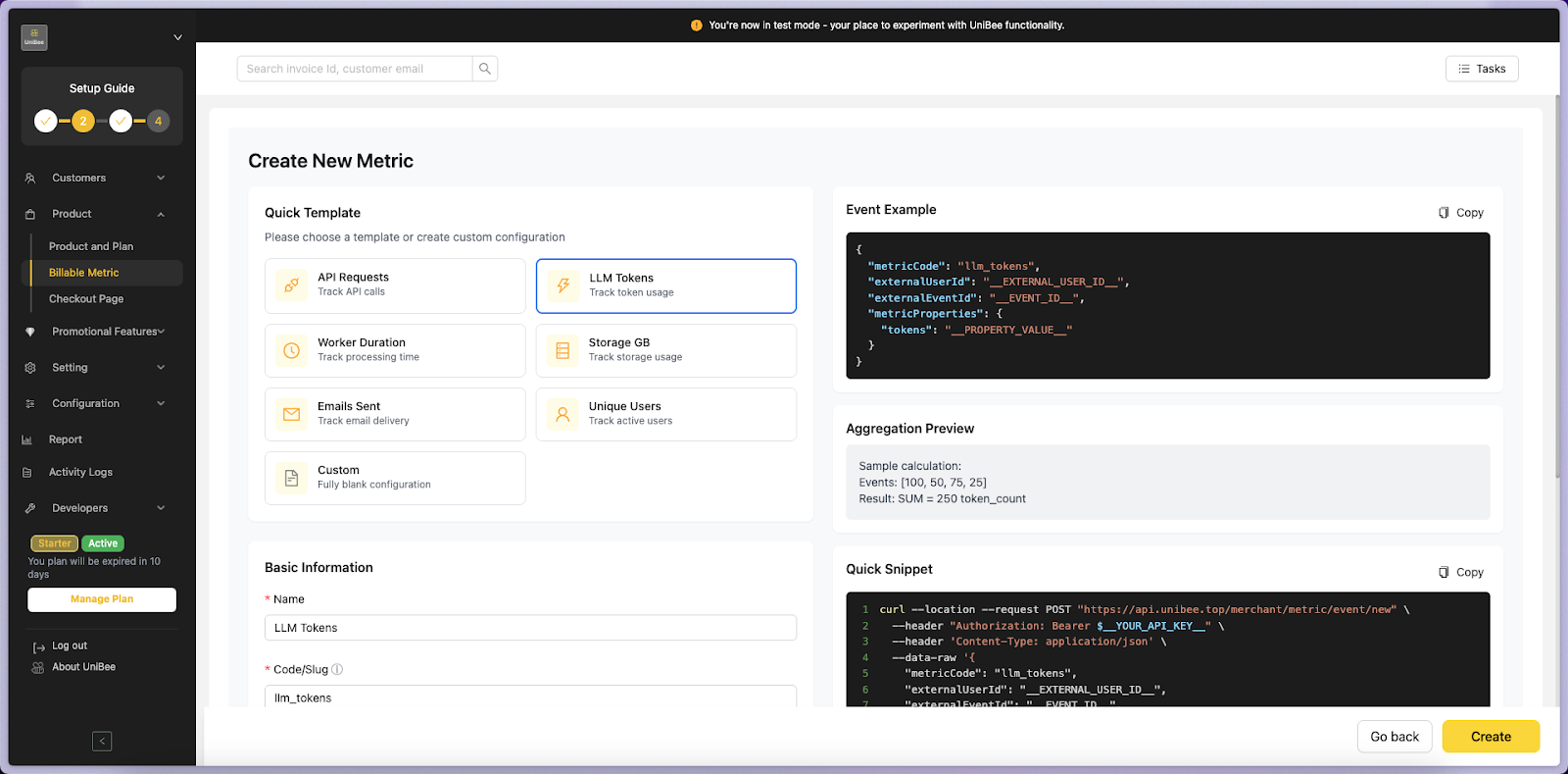 The Billing Metric module allows you to define and track billable business metrics such as API requests, storage usage, or AI token consumption.The redesigned interface introduces template-based configuration, real-time previews, and clear contextual guidance to make metric setup faster and more intuitive.